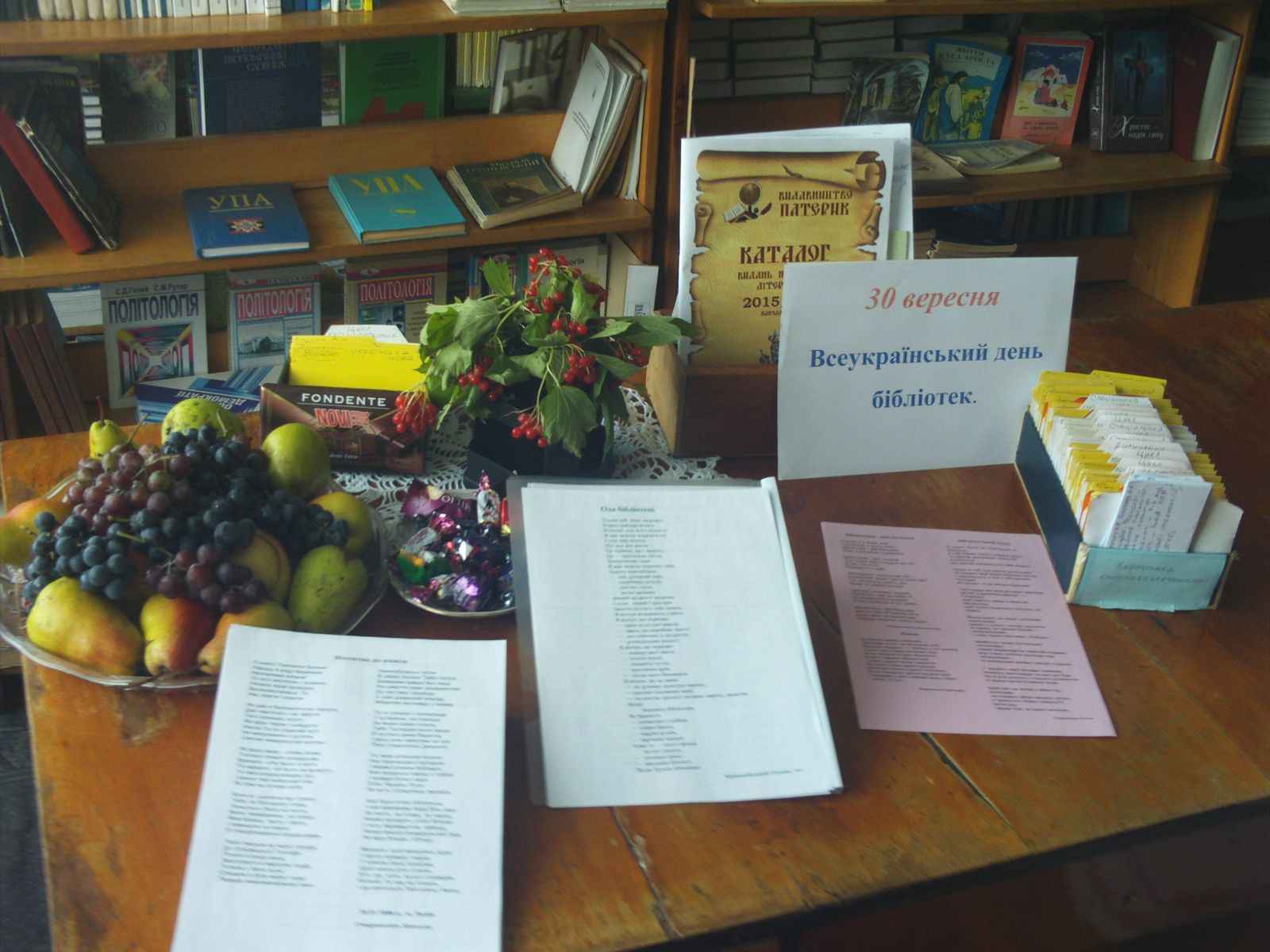 Бібліотека — це одне з найдавніших культурних надбань людства, суть якого є незмінною протягом всієї історії. Бібліотеки й дотепер залишаються особливим місцем, де люди мимоволі стишують голос, і чутно лише шурхіт сторінок, а повітря неповторно пахне типографською фарбою, клеєм і трохи пилом — адже книги можуть зберігатися століттями і дарувати свою мудрість не одному поколінню читачів. Любов до книги властива нашому народу здавна, а важливість бібліотек для національної освіти, науки та культури є очевидною для держави. Тому в Україні встановлено особливе свято — Всеукраїнський день бібліотек, який ми щороку відзначаємо 30 вересня.