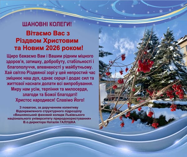 Колектив Вишнянського фахового коледжу Львівського національного університету природокористування щиро бажає всім студентам, викладачам та працівникам миру, міцного здоров’я, родинного затишку й впевненості у завтрашньому дні. Нехай різдвяна зірка надихає на нові звершення, додає сил для навчання, праці та здійснення задумів.